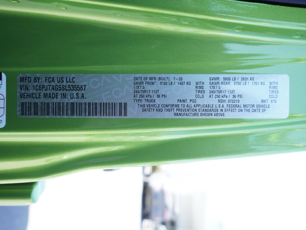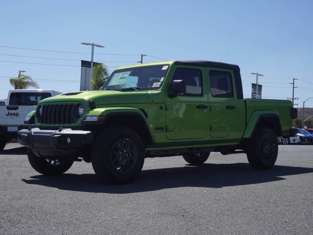 New2025 Mojito Jeep Gladiator Sport S Dark Sky Appearance Edition 4D Crew Cab $16,380 off MSRP!All vehicles subject to prior sale. New vehicle pricing includes all offers and incentives. The estimated selling price that appears after calculating dealer offers is for informational purposes, only. You may not qualify for all the offers, incentives, discounts, or financing on this page. Offers, incentives, discounts, or financing are subject to expiration and other restrictions. See Lake Elsinore Chrysler Dodge Jeep Ram for qualifications and complete details or by calling (951) 291-9777. All prices plus government fees and taxes, any finance charges, $85 documentary fee, $33 electronic vehicle registration fee, any emission testing charge and $1.75 per new tire state tire fee. The advertised sale price does not apply to a lease. Offers and prices are not available to other dealers, wholesalers, or brokers. For out-of-state purchase customers, customers must be present to purchase. If shipping is required, dealership must facilitate, no exceptions. The sales price may not be combined with any other offer. The Factory Rebates may not be available on this vehicle if you elect to take advantage of a Special Alternative APR or Special Lease program. Some Factory Rebates are California Resident specific and may vary for residents of other states. The Advertised Price for any/all vehicles offered for sale does not include optional dealer pre-installed accessories or commercial upfits or aftermarket lift kit packages which can be purchased for an additional cost. Contact us for additional information at (951) 291-9773. The sales price includes factory rebates and trade in incentives on this vehicle that are valid on a cash or financed purchase only by an individual for their personal use. All prices will be honored as cash. Some Factory Rebates and trade in incentives are California Resident specific and may be qualifying based and they may also vary for residents of other states.Global Positioning Tracking System (S.W.A.T.) Guaranteed Protection & Recovery Program, Finishing Touch Complete Synthetic Paint Sealant Application & Protection Program, NitroFill Advantage Nitrogen Filled Tires & Protection Program, Genuine Mopar Wheel Locks Anti-Theft Vehicle Wheel Protection, ParkView® / Park Assist Rear Back–Up Camera, Blind–Spot and Cross–Path Detection, Bluetooth Car Audio Receiver, SiriusXM® Satelite Radio, Apple Car Play/Android Auto, Automatic Climate Control, Backup Camera, Global Positioning System (S.W.A.T. Anti-Theft Vehicle Security System, Gladiator Sport S Dark Sky Appearance Edition 4X4, 4D Crew Cab, 3.6L V6 24V VVT, 8-Speed Automatic, 4WD, Mojito, Black w/Cloth Low-Back Bucket Seats or Power Adjust Nappa Leather Seats, ABS brakes, Advanced Brake Assist, Automatic Headlamps, Body Color Fender Flares (2-Piece), Compass, Dark Sky Appearance Package, Daytime Running Lamp System, Deep Tint Sunscreen Windows, Electronic Stability Control, Enhanc The equipment and photo display is intended to be used as an informational listing of the factory stock equipment and features for this vehicle. Equipment and features may have changed for this vehicle since its original digitally uploaded listing. All information is believed to be accurate but is not guaranteed. For specific accurate pricing information, mileage, availability, options, etc., please contact Lake Elsinore Chrysler Dodge Jeep Ram at (951) 291-9777. Applicable Incentives and Manufacturer Rebate and Expiration Breakdown’s for this vehicle are as follows. Net Cost Price does include:$1000 – 2025 West BC Retail Bonus Cash . Exp. 01/20/2026 $1500 – 2025 National Stellantis Loyalty Retail Bonus Cash . Exp. 02/02/2026 $2000 – 2025 National Select Inventory Bonus Cash w/ 3FV . Exp. 02/02/2026 $2250 – 2025 National Retail Bonus Cash . Exp. 02/02/2026 $500 – 2025 National 2025 Military Bonus Cash. Exp. 01/04/2027 , $2,500 – Retail Trade in Assistance HE2000. Exp. 01/30/2026