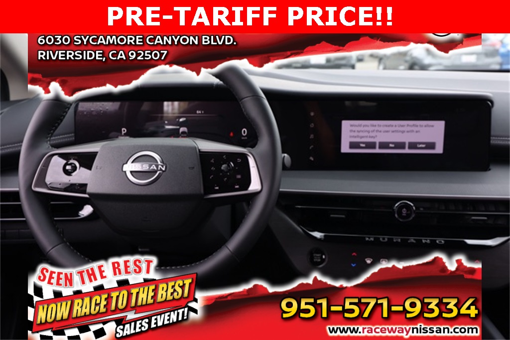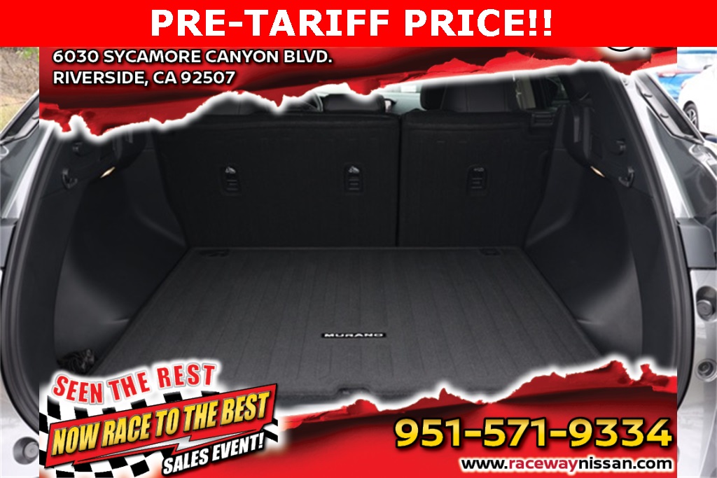 NewGun Metallic 2025 Nissan Murano SV FWD 9-Speed Automatic I4 Automatic Climate Control, Backup Camera, 9-Speed Automatic.This 2025 Gun Metallic Nissan Murano SV FWD is well equipped and includes these features and benefits: 9-Speed Automatic, 20″ Alloy Wheels, 4-Wheel Disc Brakes, 6 Speakers, ABS brakes, Air Conditioning, Alloy wheels, AM/FM radio: SiriusXM, Auto High-beam Headlights, Automatic temperature control, Brake assist, Bumpers: body-color, Child-Seat-Sensing Airbag, Compass, Delay-off headlights, Driver door bin, Driver vanity mirror, Dual front impact airbags, Dual front side impact airbags, Electronic Stability Control, Four wheel independent suspension, Front anti-roll bar, Front Bucket Seats, Front Center Armrest, Front dual zone A/C, Front reading lights, Fully automatic headlights, Heated door mirrors, Heated Front Bucket Seats, Heated front seats, Illuminated entry, Knee airbag, Low tire pressure warning, Occupant sensing airbag, Outside temperature display, Overhead airbag, Overhead console, Panic alarm, Passenger door bin, Passenger vanity mirror, Power door mirrors, Power driver seat, Power Liftgate, Power passenger seat, Power steering, Power windows, PVC (Leatherette) Seat Trim, Radio data system, Rear anti-roll bar, Rear reading lights, Rear seat center armrest, Rear side impact airbag, Rear window defroster, Rear window wiper, Remote keyless entry, Security system, Speed control, Speed-Sensitive Wipers, Split folding rear seat, Spoiler, Steering wheel mounted audio controls, Tachometer, Telescoping steering wheel, Tilt steering wheel, Traction control, Trip computer, Variably intermittent wipers, and Wireless Apple CarPlay/Wireless Android Auto. 21/27 City/Highway MPGWe have many different makes and models available including a wide selection of cars, trucks, vans, and SUVs. Raceway Nissan in Riverside County has access to thousands of new and used vehicles which means we can find the right vehicle for you and your family. We are proud to serve the city of Riverside, all of the Metro Riverside County area, and the Inland Empire from our location in Moreno Valley. We are conveniently located in Riverside near the cities of San Bernardino, Redlands, Ontario, Corona, Perris, Beaumont, Temecula, Hemet and many others. We offer military discounts and work with many Credit Unions. Photos & equipment shown are for informational purposes & reflect factory stock features actual vehicle features may differ. All information including pricing and availability is believed accurate but not guaranteed. Net cost price includes applicable rebates and incentives for which not all customers may qualify. Rebates and incentives may vary by residency, financing, and other factors and are subject to change or expiration without notice. For the most current details on pricing, rebates & eligibility contact Raceway Nissan at 951-571-9300. Price Includes:$1,000 – Preferred Lender Savings Bonus. Exp. 03/03/2026 $1,500 – Retail Trade in Bonus. Exp. 03/03/2026