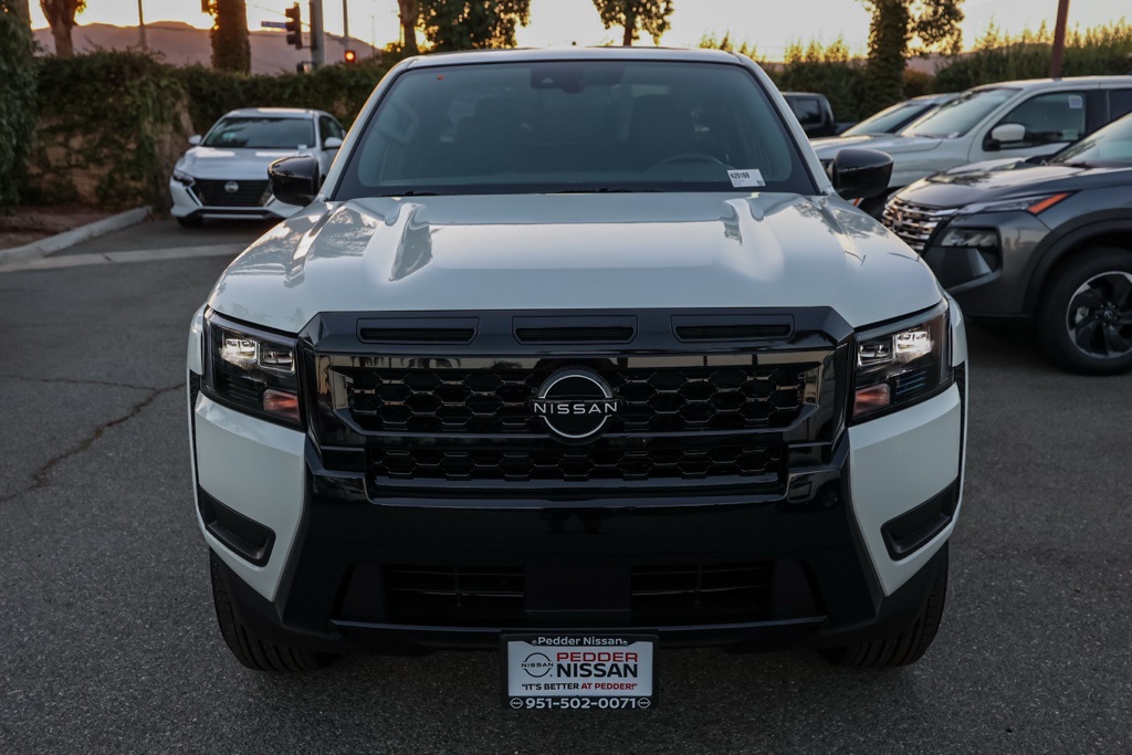 NewThis 2026 Glacier White Nissan Frontier SV RWD is well equipped and includes these features and benefits: Dark Armor Package (Dark FRONTIER Tailgate Lettering, Dark Grill Surround/Mesh/Inner Fascia, Dark Mirror Caps, and Wheels: 17″ Dark), Tow Package, 17″ Alloy Wheels, 3.692 Axle Ratio, 4-Wheel Disc Brakes, 6 Speakers, ABS brakes, Air Conditioning, Alloy wheels, AM/FM radio: SiriusXM, Anti-whiplash front head restraints, Auto High-beam Headlights, Blind Spot Warning, Brake assist, Bumpers: body-color, Carpeted Floor Mats, Delay-off headlights, Driver door bin, Driver vanity mirror, Drop-In Bed Liner & Bumper Step, Dual front impact airbags, Dual front side impact airbags, Electronic Stability Control, Emergency communication system, Front anti-roll bar, Front Bucket Seats, Front Center Armrest, Front reading lights, Front wheel independent suspension, Fully automatic headlights, Illuminated entry, Knee airbag, Low tire pressure warning, Occupant sensing airbag, Overhead airbag, Overhead console, Panic alarm, Passenger door bin, Passenger vanity mirror, Power door mirrors, Power driver seat, Power steering, Power windows, Premium Cloth Seat Trim, Radio data system, Radio: SXM/AM/FM/AUX/USB Audio System, Rear anti-roll bar, Rear seat center armrest, Rear side impact airbag, Rear step bumper, Remote keyless entry, Security system, Speed control, Speed-sensing steering, Splash Guards, Split folding rear seat, Steering wheel mounted audio controls, Tachometer, Telescoping steering wheel, Tilt steering wheel, Tow/Haul Mode Switch, Traction control, Trip computer, Variably intermittent wipers, Voltmeter, and Wireless Apple CarPlay/Wireless Android Auto Plus 3 Month 3000 Mile Warranty. See Dealer For Details. Apple Car Play/Android Auto, Automatic Climate Control, Backup Camera.• MSRP is the Manufacturer’s Suggested Retail Price, which is not necessarily the sale price and is not the advertised price. For specific pricing information, please contact Pedder Nissan at (951) 766-1446. Price does include: • The Advertised Price for any/all vehicles offered for sale does not include dealer installed accessories. These accessories can be purchased for an additional cost. Price does include: • All vehicles subject to prior sale. All prices plus government fees and taxes, any finance charges, any dealer document processing charges ($85), any electronic filing charge, and any emission testing charge. Offers and prices not available to other dealers, wholesalers, or brokers. For out of state purchase customers, customers must be present to purchase. If shipping is required, dealership must facilitate; no exceptions. Special financing in lieu of any rebates. This price may not be combined with any other offer. Price does include: • All information is believed to be accurate but is not guaranteed. For accurate pricing, mileage, availability, options, etc, please contact Pedder Nissan at (951) 766-1446. The sales price includes factory rebates and trade in incentives on this vehicle that are valid on a cash or financed purchase only by an individual for their personal use. All prices will be honored as cash. The sale price does not apply to a lease. The factory rebates may not be available on this vehicle if you elect to take advantage of a Special Alternative APR or Special Lease program. Some Factory Rebates and trade in incentives are California Resident specific and may be qualifying based and they may also vary for residents of other states. Applicable Trade in Incentives and Manufacturer Rebate and Expiration Breakdown’s for this vehicle are as follows. Price does include:$2000 – Nissan Customer Cash. Exp. 12/01/2025