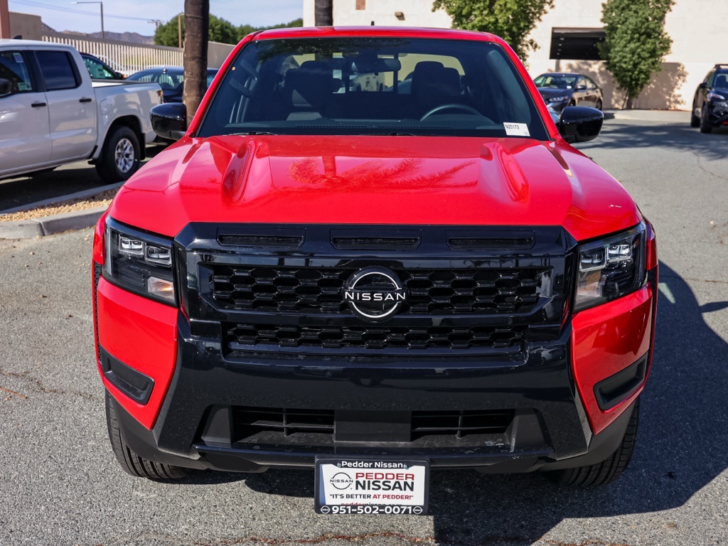 NewThis 2026 Red Alert Nissan Frontier SV RWD is well equipped and includes these features and benefits: Dark Armor Package (Dark FRONTIER Tailgate Lettering, Dark Grill Surround/Mesh/Inner Fascia, Dark Mirror Caps, and Wheels: 17″ Dark), Tow Package, 17″ Alloy Wheels, 3.692 Axle Ratio, 4-Wheel Disc Brakes, 6 Speakers, ABS brakes, Air Conditioning, Alloy wheels, AM/FM radio: SiriusXM, Anti-whiplash front head restraints, Auto High-beam Headlights, Blind Spot Warning, Brake assist, Bumpers: body-color, Carpeted Floor Mats, Delay-off headlights, Driver door bin, Driver vanity mirror, Drop-In Bed Liner & Bumper Step, Dual front impact airbags, Dual front side impact airbags, Electronic Stability Control, Emergency communication system, Front anti-roll bar, Front Bucket Seats, Front Center Armrest, Front reading lights, Front wheel independent suspension, Fully automatic headlights, Illuminated entry, Knee airbag, Low tire pressure warning, Occupant sensing airbag, Overhead airbag, Overhead console, Panic alarm, Passenger door bin, Passenger vanity mirror, Power door mirrors, Power driver seat, Power steering, Power windows, Premium Cloth Seat Trim, Radio data system, Radio: SXM/AM/FM/AUX/USB Audio System, Rear anti-roll bar, Rear seat center armrest, Rear side impact airbag, Rear step bumper, Remote keyless entry, Security system, Speed control, Speed-sensing steering, Splash Guards, Split folding rear seat, Steering wheel mounted audio controls, Tachometer, Telescoping steering wheel, Tilt steering wheel, Tow/Haul Mode Switch, Traction control, Trip computer, Variably intermittent wipers, Voltmeter, and Wireless Apple CarPlay/Wireless Android Auto Plus 3 Month 3000 Mile Warranty. See Dealer For Details. Apple Car Play/Android Auto, Automatic Climate Control, Backup Camera.• MSRP is the Manufacturer’s Suggested Retail Price, which is not necessarily the sale price and is not the advertised price. For specific pricing information, please contact Pedder Nissan at (951) 766-1446. Price does include: • The Advertised Price for any/all vehicles offered for sale does not include dealer installed accessories. These accessories can be purchased for an additional cost. Price does include: • All vehicles subject to prior sale. All prices plus government fees and taxes, any finance charges, any dealer document processing charges ($85), any electronic filing charge, and any emission testing charge. Offers and prices not available to other dealers, wholesalers, or brokers. For out of state purchase customers, customers must be present to purchase. If shipping is required, dealership must facilitate; no exceptions. Special financing in lieu of any rebates. This price may not be combined with any other offer. Price does include: • All information is believed to be accurate but is not guaranteed. For accurate pricing, mileage, availability, options, etc, please contact Pedder Nissan at (951) 766-1446. The sales price includes factory rebates and trade in incentives on this vehicle that are valid on a cash or financed purchase only by an individual for their personal use. All prices will be honored as cash. The sale price does not apply to a lease. The factory rebates may not be available on this vehicle if you elect to take advantage of a Special Alternative APR or Special Lease program. Some Factory Rebates and trade in incentives are California Resident specific and may be qualifying based and they may also vary for residents of other states. Applicable Trade in Incentives and Manufacturer Rebate and Expiration Breakdown’s for this vehicle are as follows. Price does include:$2000 – Nissan Customer Cash. Exp. 12/01/2025