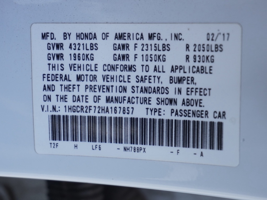 Used2017 White Orchid Pearl Certified. Honda Accord 4D Sedan EX Clean CARFAX. Priced below KBB Fair Purchase Price!Certification Program Details: • 3 Month/3,000 Mile Max Care Limited Warranty (whichever comes first). • Maximum Care covers most vehicle components (Over 5,000 Components). • 125-Point Vehicle Inspection. • CarFax Vehicle History Report. • $500 Emergency Trip Reimbursement. • 45/Day Car Rental or Taxi Allowance. • $100 “Sign-and-Go” Roadside Assistance. • $75 Additional in the instances with a trailer. • 3 Month Trial subscription to SiriusXM. • A deductible applies per covered repair visit. Priced to Go! Unbeatable Prices: Our dynamic pricing ensures you get unbeatable prices on vehicles that not only fit your budget but also exceed your expectations. We understand the importance of getting the most value for your hard-earned money. Schedule Your Test Drive: Don’t miss out on this opportunity. Schedule your test drive now before the vehicle you desire is gone. Call us at (951) 291-9773 or visit our dealership at lakecdjr.com to experience the thrill of driving your new dream car. Join the ranks of our satisfied customers from Palm Springs, Lake Elsinore, San Jacinto, Sun City, Riverside, Menifee, Murrieta, Temecula, Moreno Valley, Perris, Escondido, Corona, and San Diego County. They’ve discovered the exceptional value we offer, and you can too.All vehicles subject to prior sale. The estimated selling price that appears after calculating dealer offers, financing and discounts is for informational purposes, only. You may not qualify for all the offers, incentives or financing on this page. Offers, incentives, or financing are subject to expiration, credit worthiness and other restrictions. See Lake Elsinore Chrysler Dodge Jeep Ram for qualifications and complete details or by calling (951) 291-9777. All prices plus government fees and taxes, any finance charges, $85 documentary fee, $33 electronic vehicle registration fee, any emission testing charge and $1.75 per new tire state tire fee. Offers and prices are not available to other dealers, wholesalers, or brokers. For out-of-state purchase customers, customers must be present to purchase. If shipping is required, dealership must facilitate, no exceptions. The sales price may not be combined with any other offer. The Advertised Price for any/all vehicles offered for sale does not include optional dealer pre-installed accessories or commercial upfits or aftermarket lift kit packages which can be purchased for an additional cost. Contact us for additional information at (951) 291-9773. All prices will be honored as cash.CVT FWD 2017 Honda Accord EX Sedan 4D KARR Bluetooth Security System Anti-Theft Vehicle Security System & Protection Program, Global Positioning Tracking System (S.W.A.T.) Guaranteed Protection & Recovery Program, Finishing Touch Complete Synthetic Paint Sealant Application & Protection Program, NitroFill Advantage Nitrogen Filled Tires & Protection Program, Genuine Mopar Wheel Locks Anti-Theft Vehicle Wheel Protection, ParkView® / Park Assist Rear Back–Up Camera, Blind–Spot and Cross–Path Detection, Bluetooth Car Audio Receiver, SiriusXM® Satelite Radio, Apple Car Play/Android Auto, Automatic Climate Control, Backup Camera, Accord EX Sedan 4D, 4D Sedan, 2.4L I4 DOHC i-VTEC 16V, CVT, FWD, White Orchid Pearl, Black w/Cloth Seat Trim.Awards: * 2017 IIHS Top Safety Pick+ (When equipped with Honda Sensing and specific headlights) * 2017 KBB.com 10 Most Awarded Brands * 2017 KBB.com Brand Image AwardsKelley Blue Book Brand Image Awards are based on the Brand Watch(tm) study from Kelley Blue Book Market Intelligence. Award calculated among non-luxury shoppers. For more information, visit www.kbb.com. Kelley Blue Book is a registered trademark of Kelley Blue Book Co., Inc. 27/36 City/Highway MPG