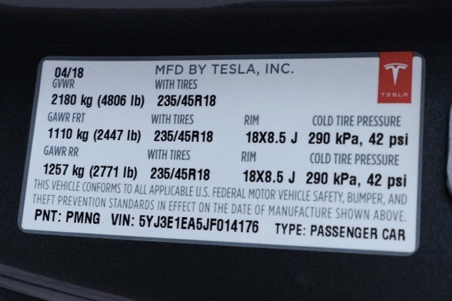 UsedThis 2018 Midnight Silver Metallic Tesla Model 3 Long Range RWD is well equipped and includes these features and benefits: 15 Speakers, 4-Wheel Disc Brakes, ABS brakes, Air Conditioning, Alloy wheels, Auto High-beam Headlights, Auto-dimming door mirrors, Auto-dimming Rear-View mirror, Automatic temperature control, Brake assist, Bumpers: body-color, Compass, Delay-off headlights, Driver door bin, Driver vanity mirror, Dual front impact airbags, Dual front side impact airbags, Electronic Stability Control, Exterior Parking Camera Rear, Four wheel independent suspension, Front anti-roll bar, Front Bucket Seats, Front Center Armrest, Front dual zone A/C, Front fog lights, Front reading lights, Fully automatic headlights, Garage door transmitter: Homelink, Genuine wood dashboard insert, Heated door mirrors, Heated Front Bucket Seats, Heated front seats, Heated rear seats, Illuminated entry, Knee airbag, Lane Departure Warning System, Low tire pressure warning, Memory seat, Navigation System, Occupant sensing airbag, Outside temperature display, Overhead airbag, Passenger door bin, Passenger vanity mirror, Power door mirrors, Power driver seat, Power passenger seat, Power steering, Power windows, Radio data system, Radio: FM w/Premium Audio System, Rear reading lights, Rear seat center armrest, Rear window defroster, Remote keyless entry, Security system, Speed control, Speed-sensing steering, Split folding rear seat, Steering wheel memory, Steering wheel mounted A/C controls, Steering wheel mounted audio controls, Synthetic Leather Seat Trim, Telescoping steering wheel, Tilt steering wheel, Traction control, Trip computer, Variably intermittent wipers, and Wheels: 18″ Aero. Recent Arrival!Priced below KBB Fair Purchase Price!Odometer is 35510 miles below market average! 136/123 City/Highway MPG CARFAX One-Owner. Clean CARFAX.We have many different makes and models available including a wide selection of cars, trucks, vans, and SUVs. Raceway Nissan in Riverside County has access to thousands of new and used vehicles which means we can find the right vehicle for you and your family. We are proud to serve the city of Riverside, all of the Metro Riverside County area, and the Inland Empire from our location in Moreno Valley. We are conveniently located in Riverside near the cities of San Bernardino, Redlands, Ontario, Corona, Perris, Beaumont, Temecula, Hemet and many others. We offer military discounts and work with many Credit Unions.