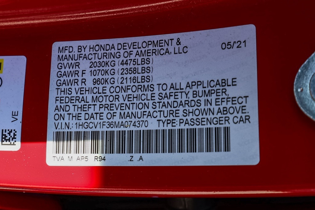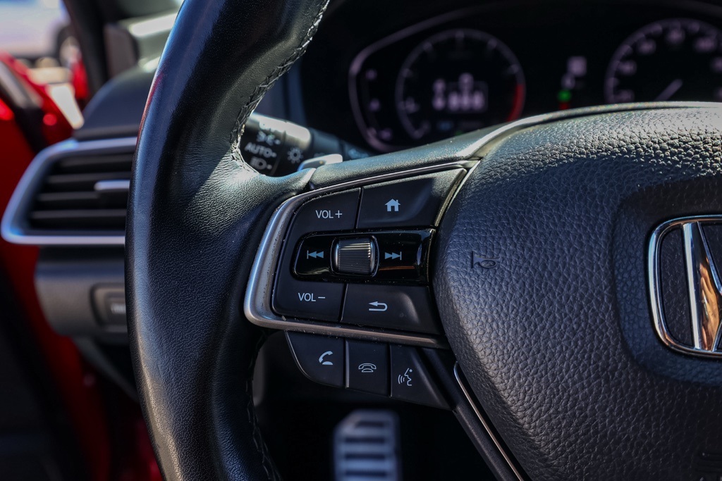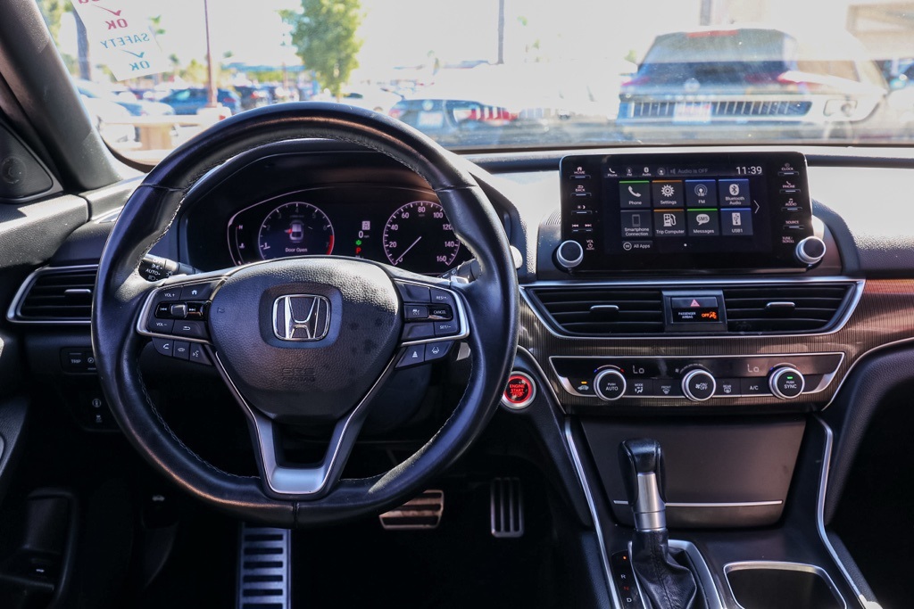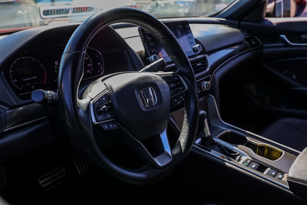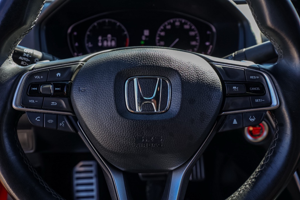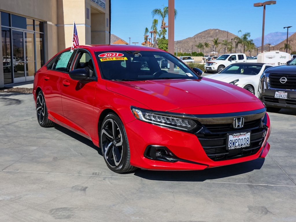 UsedThis 2021 Red Honda Accord Sport FWD is well equipped and includes these features and benefits: Black Cloth, 4-Wheel Disc Brakes, 8 Speakers, ABS brakes, Adaptive Cruise Control: Adaptive Cruise Control (ACC) with Low-Speed Follow, Air Conditioning, Alloy wheels, AM/FM radio, Apple CarPlay/Android Auto, Auto High-beam Headlights, Automatic temperature control, Brake assist, Bumpers: body-color, Cloth Seat Trim, Delay-off headlights, Driver door bin, Driver vanity mirror, Dual front impact airbags, Dual front side impact airbags, Electronic Stability Control, Emergency communication system: HondaLink, Exterior Parking Camera Rear, Forward collision: Collision Mitigation Braking System (CMBS) + FCW mitigation, Four wheel independent suspension, Front anti-roll bar, Front Bucket Seats, Front Center Armrest, Front dual zone A/C, Front fog lights, Front reading lights, Fully automatic headlights, Illuminated entry, Knee airbag, Lane Departure Warning System, Leather Shift Knob, Leather steering wheel, Low tire pressure warning, Occupant sensing airbag, Outside temperature display, Overhead airbag, Overhead console, Panic alarm, Passenger door bin, Passenger vanity mirror, Power door mirrors, Power driver seat, Power steering, Power windows, Radio data system, Radio: 180-Watt AM/FM Audio System, Rear anti-roll bar, Rear seat center armrest, Rear window defroster, Remote keyless entry, Security system, Speed control, Speed-sensing steering, Speed-Sensitive Wipers, Split folding rear seat, Spoiler, Steering wheel mounted audio controls, Tachometer, Telescoping steering wheel, Tilt steering wheel, Traction control, Trip computer, Variably intermittent wipers, and Wheels: 19″ Machine-Finished Alloy w/Black Inserts Plus 3 Month 3000 Mile Warranty. See Dealer For Details. We have many different makes and models available including a wide selection of cars, trucks, vans, and SUV’s. Don’t see something you like! Pedder Nissan has access to thousands of new and used vehicles which means we can find the right vehicle FOR YOU. The Advertised Price for any vehicle does not include dealer installed accessories. These accessories can be purchased for an additional cost. All vehicles subject to prior sale. All prices plus government fees and taxes, any finance charges, any dealer document processing charges ($85), any electronic filing charge, and any emission testing charge. Offers and prices not available to other dealers, wholesalers, or brokers. This price may not be combined with any other offer. While every reasonable effort is made to ensure the accuracy of this information, we are not responsible for any errors or omissions contained on these pages. We are proud to serve the Hemet area from our Auto Mall Location. We work with most Credit Unions and we offer Military and First Responder discounts. Please verify all pricing, vehicle equipment, and any additional information in question with Pedder Nissan (951) 766-1446. Apple Car Play/Android Auto, Automatic Climate Control, Backup Camera, Black Cloth. Priced below KBB Fair Purchase Price! 2021 Honda Accord SportClean CARFAX. 29/35 City/Highway MPG