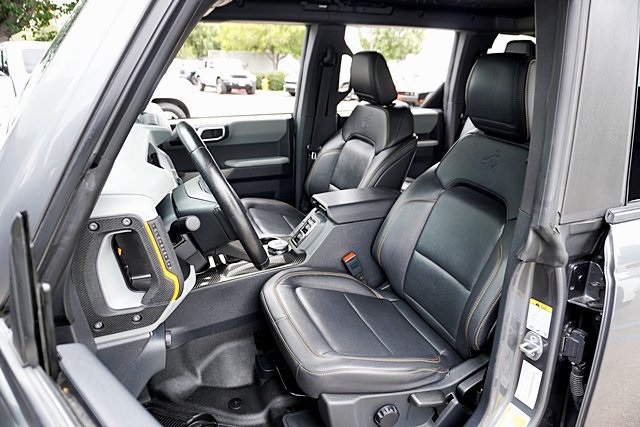 UsedThis 2022 Carbonized Gray Metallic Ford Bronco Badlands 4WD is well equipped and includes these features and benefits: Equipment Group 333A High Package (12″ LCD Capacitive Touchscreen w/Swipe Capability, 2-Door Intelligent Access w/Lock/Unlock, 360-Degree Camera, Additional Sound Deadening, Ambient Footwell Lighting, Auto-Dimming Interior Rear-View Mirror, Connected Navigation, Dr & Pass Illuminated Sliding Visor Vanity Mirrors, Dual-Zone Electronic Automatic Temperature Control, Enhanced Voice Recognition, Front Parking Sensors, Front Row Heated Seats, Information on Demand Panel, Power Outlet – Back Side of Center Floor Console, Rear Parking Sensors, and Sideview Mirrors), 4-Wheel Disc Brakes, 6 Speakers, ABS brakes, Air Conditioning, AM/FM radio: SiriusXM with 360L, AM/FM Stereo, Auto High-beam Headlights, Brake assist, Compass, Delay-off headlights, Driver door bin, Driver vanity mirror, Dual front impact airbags, Dual front side impact airbags, Electronic Stability Control, Emergency communication system: 911 Assist, Exterior Parking Camera Rear, Front anti-roll bar, Front Bucket Seats, Front Center Armrest, Front reading lights, Front wheel independent suspension, Fully automatic headlights, Heated door mirrors, Illuminated entry, Integrated roll-over protection, Low tire pressure warning, Occupant sensing airbag, Outside temperature display, Overhead airbag, Overhead console, Panic alarm, Passenger door bin, Passenger vanity mirror, Power door mirrors, Power steering, Power windows, Radio data system, Remote keyless entry, Security system, SiriusXM Radio w/360L, Speed control, Split folding rear seat, Steering wheel mounted audio controls, SYNC 4, Tachometer, Telescoping steering wheel, Tilt steering wheel, Traction control, Trip computer, Variably intermittent wipers, and Wheels: 17″ Black High Gloss-Painted Aluminum Prices shown are manufacturer suggested retail price only and do not include taxes, license, documentation fee, smog fee, dealer installed options and other applicable charges. Vehicles are subject to prior sale. Vehicle information is based on standard equipment and may vary from vehicle to vehicle. Not responsible for typographical errors. Priced below KBB Fair Purchase Price!17/17 City/Highway MPGAwards: * NACTOY 2022 North American Utility of the Year