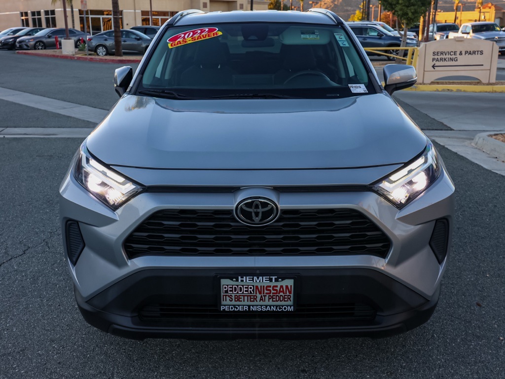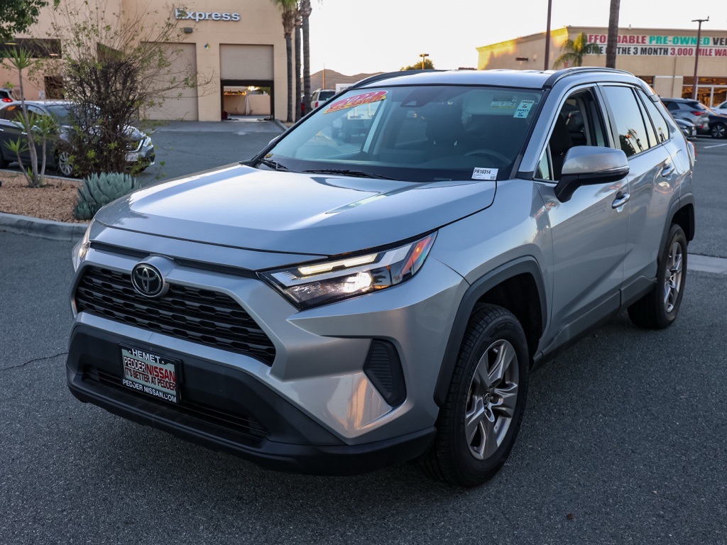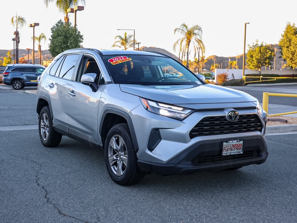 UsedThis 2022 Silver Toyota RAV4 XLE AWD is well equipped and includes these features and benefits: AWD, Black Cloth, 4-Wheel Disc Brakes, 6 Speakers, ABS brakes, Air Conditioning, Alloy wheels, AM/FM radio: SiriusXM, AM/FM Stereo, Apple CarPlay/Android Auto, Auto High-beam Headlights, Automatic temperature control, Axle Ratio: 3.177, Brake assist, Bumpers: body-color, Delay-off headlights, Driver door bin, Driver vanity mirror, Dual front impact airbags, Dual front side impact airbags, Electronic Stability Control, Emergency communication system: Safety Connect with 1-year trial, Exterior Parking Camera Rear, Fabric Seat Trim, Four wheel independent suspension, Front anti-roll bar, Front Bucket Seats, Front Center Armrest, Front dual zone A/C, Front reading lights, Fully automatic headlights, Heated door mirrors, Illuminated entry, Knee airbag, Low tire pressure warning, Occupant sensing airbag, Outside temperature display, Overhead airbag, Overhead console, Panic alarm, Passenger door bin, Passenger vanity mirror, Power door mirrors, Power driver seat, Power steering, Power windows, Radio data system, Rear anti-roll bar, Rear seat center armrest, Rear window defroster, Rear window wiper, Remote keyless entry, Roof rack: rails only, Speed control, Speed-sensing steering, Split folding rear seat, Spoiler, Steering wheel mounted audio controls, Tachometer, Telescoping steering wheel, Tilt steering wheel, Traction control, Trip computer, Turn signal indicator mirrors, Variably intermittent wipers, and Wheels: 17″ 5-Spoke Silver Alloy Plus 3 Month 3000 Mile Warranty. See Dealer For Details. We have many different makes and models available including a wide selection of cars, trucks, vans, and SUV’s. Don’t see something you like! Pedder Nissan has access to thousands of new and used vehicles which means we can find the right vehicle FOR YOU. The Advertised Price for any vehicle does not include dealer installed accessories. These accessories can be purchased for an additional cost. All vehicles subject to prior sale. All prices plus government fees and taxes, any finance charges, any dealer document processing charges ($85), any electronic filing charge, and any emission testing charge. Offers and prices not available to other dealers, wholesalers, or brokers. This price may not be combined with any other offer. While every reasonable effort is made to ensure the accuracy of this information, we are not responsible for any errors or omissions contained on these pages. We are proud to serve the Hemet area from our Auto Mall Location. We work with most Credit Unions and we offer Military and First Responder discounts. Please verify all pricing, vehicle equipment, and any additional information in question with Pedder Nissan (951) 766-1446. Apple Car Play/Android Auto, Automatic Climate Control, Backup Camera, AWD, Black Cloth. CARFAX One-Owner. Priced below KBB Fair Purchase Price! 2022 Toyota RAV4 XLEClean CARFAX. 27/33 City/Highway MPG