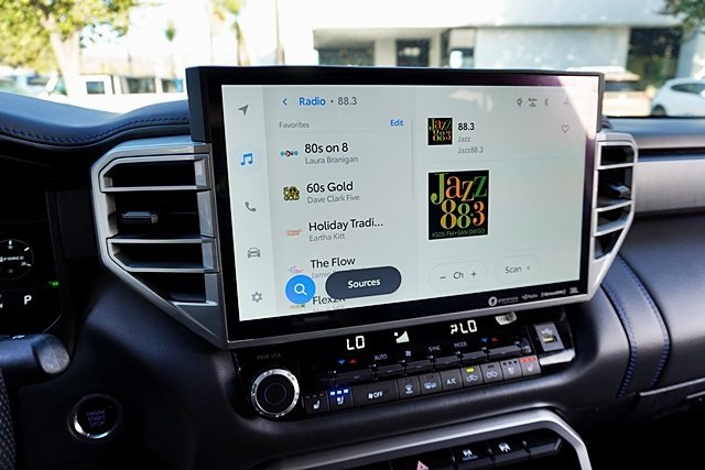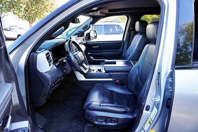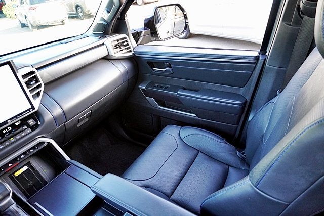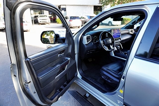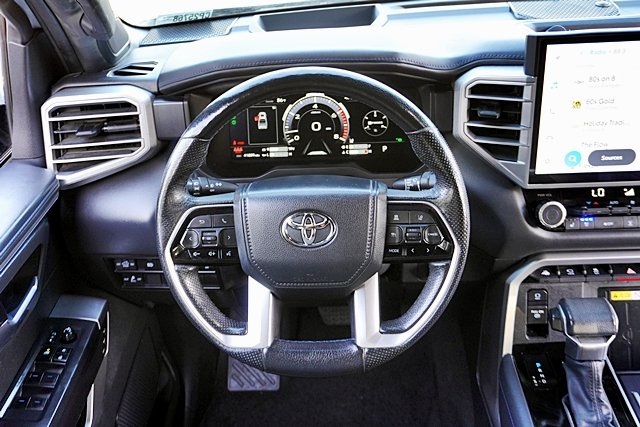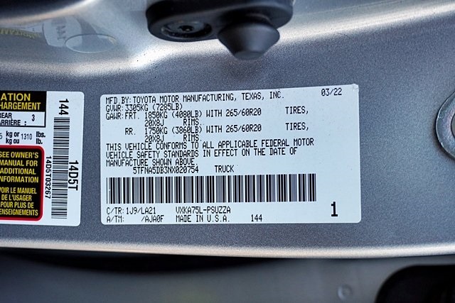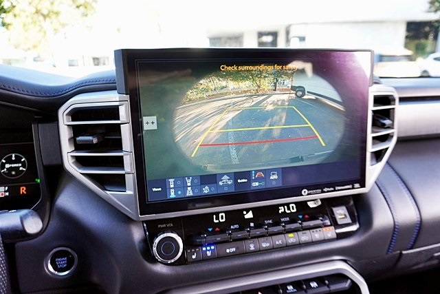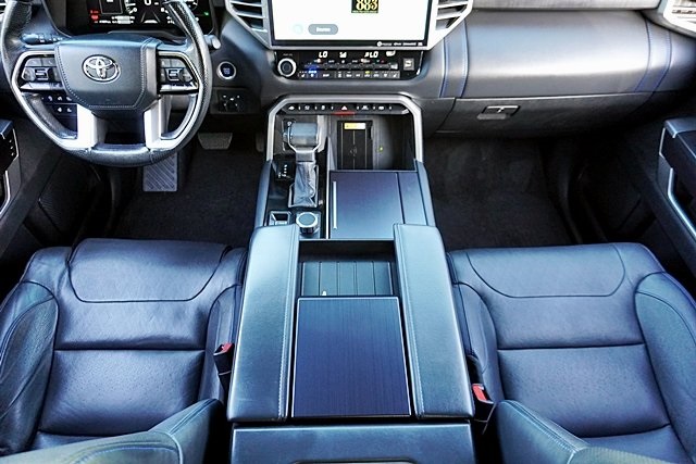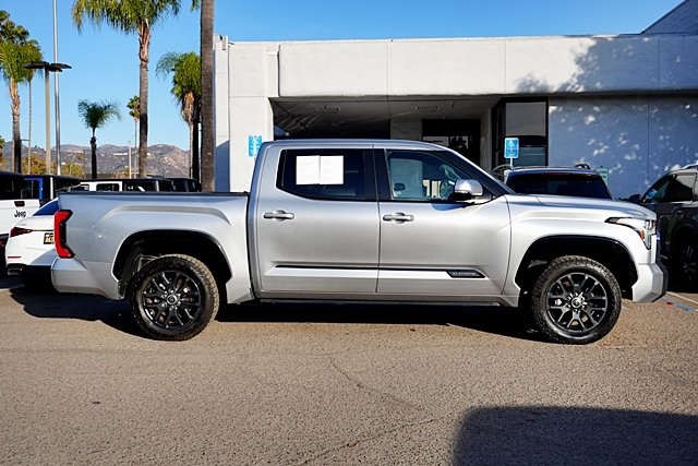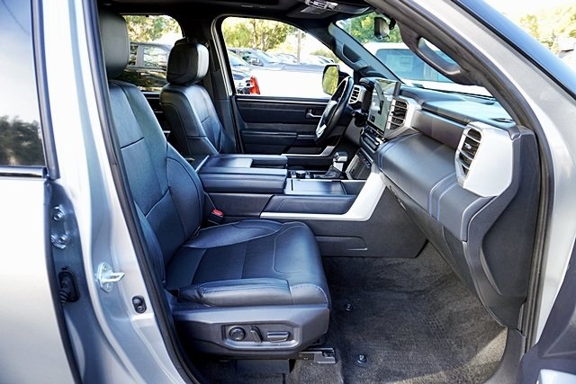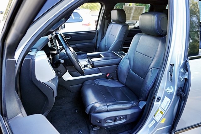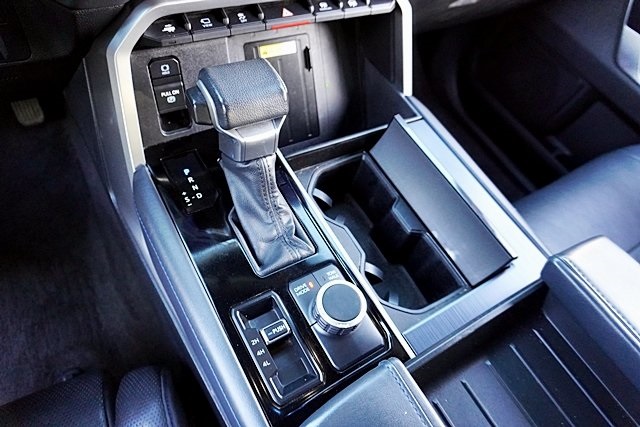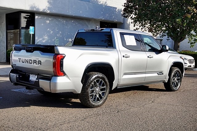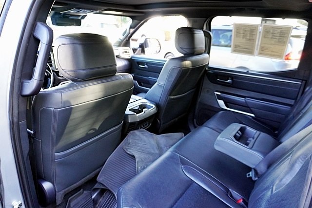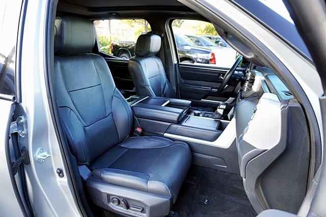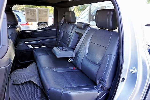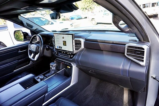 UsedThis 2022 Celestial Silver Metallic Toyota Tundra Platinum 4WD is well equipped and includes these features and benefits: Advanced Package (Color Head Up Display), 4WD, Black Leather, 10-Way Pwr Adj Heated and Ventilated Front Seats, 12 Speakers, 3.31 Axle Ratio, 4-Wheel Disc Brakes, ABS brakes, Air Conditioning, Alloy wheels, AM/FM radio: SiriusXM, Apple CarPlay/Android Auto, Auto High-beam Headlights, Auto-dimming door mirrors, Auto-dimming Rear-View mirror, Automatic temperature control, Brake assist, Bumpers: body-color, Delay-off headlights, Driver door bin, Driver vanity mirror, Dual front impact airbags, Dual front side impact airbags, Electronic Stability Control, Emergency communication system: Safety Connect with 1-year trial, Front anti-roll bar, Front Bucket Seats, Front Center Armrest, Front dual zone A/C, Front fog lights, Front reading lights, Front wheel independent suspension, Fully automatic headlights, Garage door transmitter: HomeLink, Heated door mirrors, Heated front seats, Heated rear seats, Heated steering wheel, Illuminated entry, Knee airbag, Leather Seat Trim, Leather Shift Knob, Low tire pressure warning, Memory seat, Navigation System, Occupant sensing airbag, Outside temperature display, Overhead airbag, Overhead console, Panic alarm, Passenger door bin, Passenger vanity mirror, Power door mirrors, Power driver seat, Power moonroof, Power passenger seat, Power steering, Power windows, Radio data system, Radio: Audio Multimedia System, Rain sensing wipers, Rear reading lights, Rear seat center armrest, Rear step bumper, Rear window defroster, Remote keyless entry, Safety Connect, Security system, Speed control, Speed-sensing steering, Split folding rear seat, Steering wheel memory, Steering wheel mounted audio controls, Tachometer, Telescoping steering wheel, Tilt steering wheel, Traction control, Trip computer, Turn signal indicator mirrors, Variably intermittent wipers, Ventilated front seats, Ventilated rear seats, Voltmeter, and Wheels: 20″ Dark Painted Alloy Prices shown are manufacturer suggested retail price only and do not include taxes, license, documentation fee, smog fee, dealer installed options and other applicable charges. Vehicles are subject to prior sale. Vehicle information is based on standard equipment and may vary from vehicle to vehicle. Not responsible for typographical errors. CARFAX One-Owner. Priced below KBB Fair Purchase Price!17/22 City/Highway MPGAwards: * ALG Residual Value Awards, Residual Value Awards