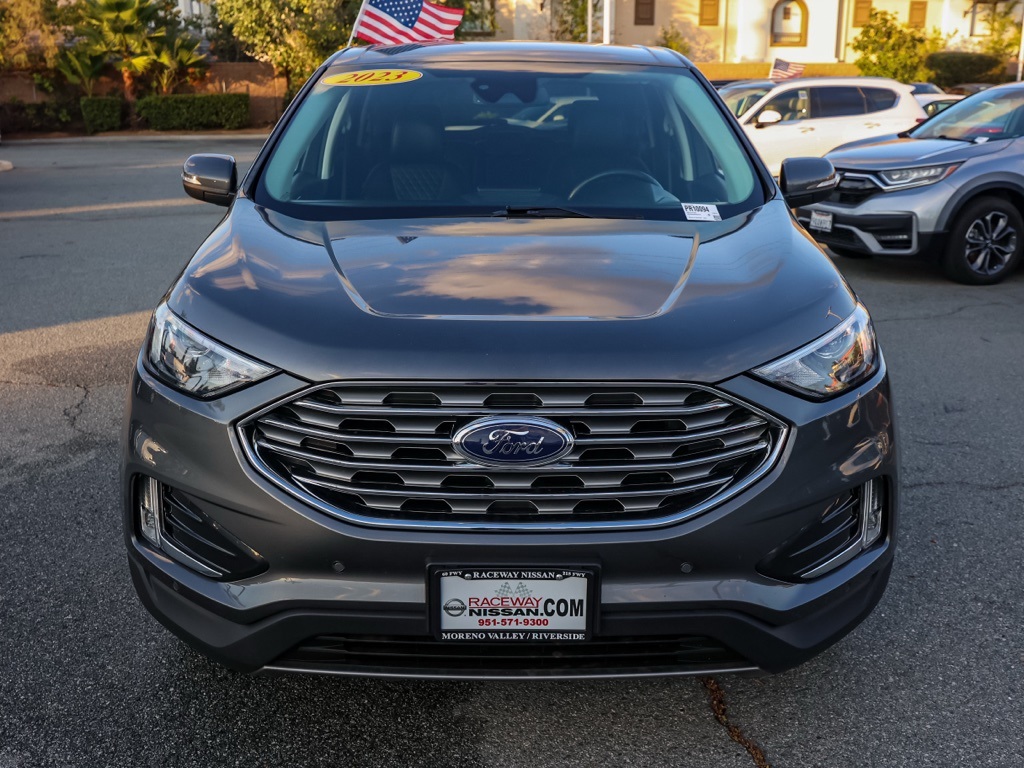 UsedThis 2023 Gray Metallic Ford Edge Titanium AWD is well equipped and includes these features and benefits: Equipment Group 300A, AWD, 12 Speakers, 3.80 Axle Ratio, 4-Wheel Disc Brakes, ABS brakes, ActiveX-Trimmed Heated Sport Bucket Seats, Air Conditioning, Alloy wheels, AM/FM radio: SiriusXM with 360L, Auto High-beam Headlights, Auto-dimming Rear-View mirror, Automatic temperature control, Brake assist, Bumpers: body-color, Compass, Delay-off headlights, Driver door bin, Driver vanity mirror, Dual front impact airbags, Dual front side impact airbags, Electronic Stability Control, Emergency communication system: SYNC 4 911 Assist, FordPass Connect, Four wheel independent suspension, Front anti-roll bar, Front Bucket Seats, Front Center Armrest w/Storage, Front dual zone A/C, Front fog lights, Front License Plate Bracket, Front reading lights, Fully automatic headlights, Garage door transmitter, Heated door mirrors, Heated front seats, Heated steering wheel, Illuminated entry, Knee airbag, Leather steering wheel, Low tire pressure warning, Memory seat, Occupant sensing airbag, Outside temperature display, Overhead airbag, Overhead console, Panic alarm, Passenger door bin, Passenger vanity mirror, Power door mirrors, Power driver seat, Power Liftgate, Power passenger seat, Power steering, Power windows, Radio: B&O Sound System by Bang & Olufsen, Rain sensing wipers, Rear anti-roll bar, Rear reading lights, Rear seat center armrest, Rear window defroster, Rear window wiper, Remote keyless entry, Security system, SiriusXM w/360L, Speed control, Speed-Sensitive Wipers, Split folding rear seat, Spoiler, Steering wheel mounted audio controls, SYNC 4A w/Enhanced Voice Recognition, Tachometer, Telescoping steering wheel, Tilt steering wheel, Traction control, Trip computer, Turn signal indicator mirrors, Variably intermittent wipers, and Wheels: 19″ Luster Nickel-Painted Aluminum.Priced below KBB Fair Purchase Price!Odometer is 5542 miles below market average! 21/28 City/Highway MPG CARFAX One-Owner.We have many different makes and models available including a wide selection of cars, trucks, vans, and SUVs. Raceway Nissan in Riverside County has access to thousands of new and used vehicles which means we can find the right vehicle for you and your family. We are proud to serve the city of Riverside, all of the Metro Riverside County area, and the Inland Empire from our location in Moreno Valley. We are conveniently located in Riverside near the cities of San Bernardino, Redlands, Ontario, Corona, Perris, Beaumont, Temecula, Hemet and many others. We offer military discounts and work with many Credit Unions.