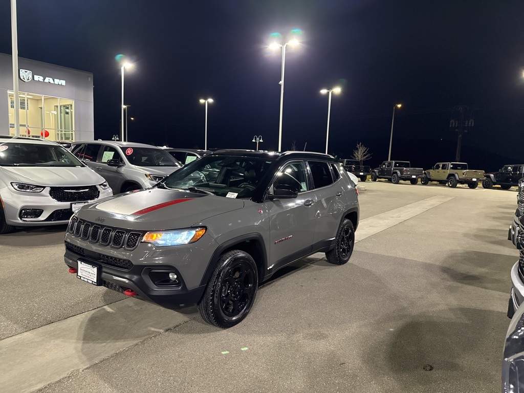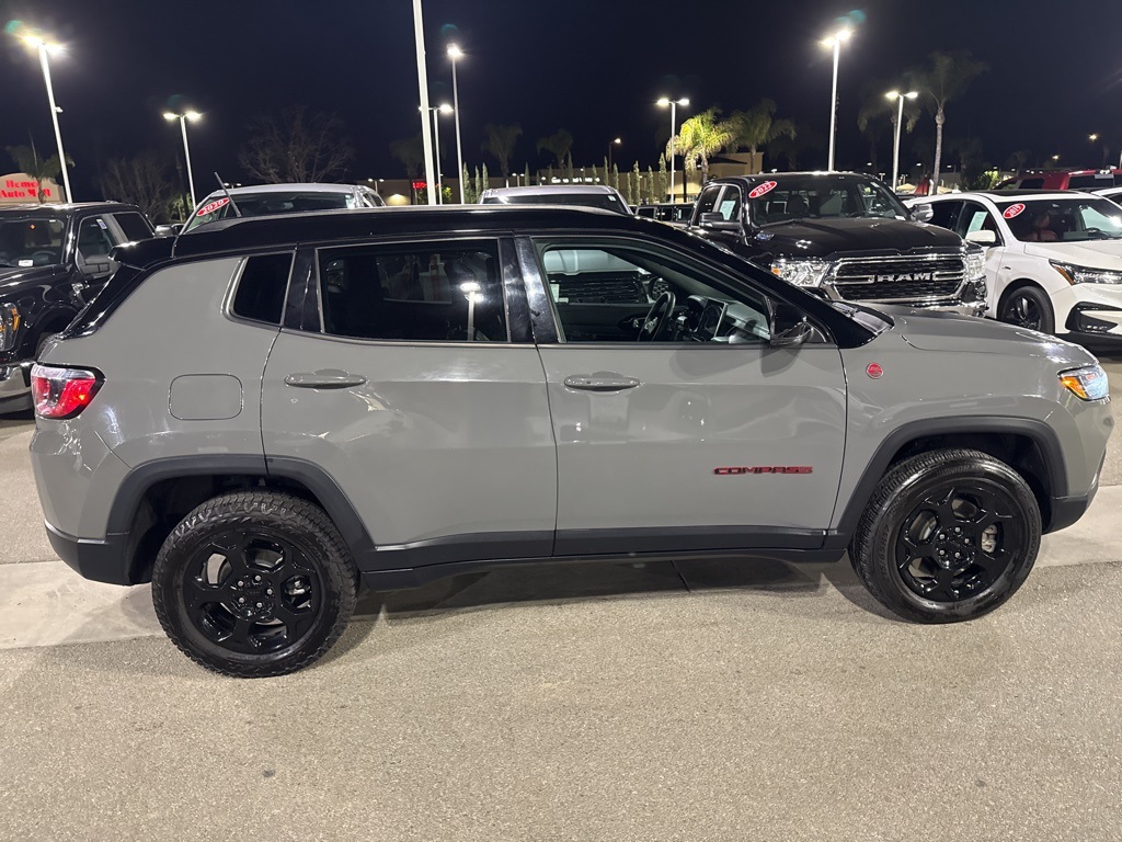 UsedThis 2023 Sting-Gray Clearcoat Jeep Compass Trailhawk 4WD is well equipped and includes these features and benefits: Quick Order Package 29E, 4WD, 10.1″ Touchscreen Display, 4-Wheel Disc Brakes, 4.398 Final Drive Ratio, 6 Speakers, ABS brakes, Air Conditioning, Alloy wheels, AM/FM radio: SiriusXM, Auto High-beam Headlights, Auto-dimming Rear-View mirror, Automatic temperature control, Brake assist, Bumpers: body-color, Compass, Delay-off headlights, Disassociated Touchscreen Display, Driver door bin, Driver vanity mirror, Dual front impact airbags, Dual front side impact airbags, Electronic Stability Control, Four wheel independent suspension, Front anti-roll bar, Front Bucket Seats, Front Center Armrest w/Storage, Front dual zone A/C, Front fog lights, Front License Plate Bracket, Front reading lights, Fully automatic headlights, Heated door mirrors, Illuminated entry, Knee airbag, Leather Shift Knob, Low tire pressure warning, Occupant sensing airbag, Outside temperature display, Overhead airbag, Overhead console, Panic alarm, ParkView Rear Back-Up Camera, Passenger door bin, Passenger vanity mirror, Power door mirrors, Power steering, Power windows, Premium Cloth/Leather Trim Bucket Seats, Radio: Uconnect 5 w/10.1″ Display, Rain sensing wipers, Rear anti-roll bar, Rear seat center armrest, Rear window defroster, Rear window wiper, Remote keyless entry, Security system, SiriusXM Radio Service, Speed control, Split folding rear seat, Spoiler, Steering wheel mounted audio controls, Tachometer, Telescoping steering wheel, Tilt steering wheel, Traction control, Trip computer, Turn signal indicator mirrors, Variably intermittent wipers, and Wheels: 17″ x 6.5″ Painted Black Aluminum. Apple Car Play/Android Auto, Automatic Climate Control, 4WD. 8-Speed Automatic Clean CARFAX.Recent Arrival! 24/32 City/Highway MPGWe have many different makes and models available including a wide selection of cars, trucks, vans, and SUV’s. Lake Elsinore CDJR auto group has access to thousands of new and used vehicles which means we can find the right vehicle FOR YOU.