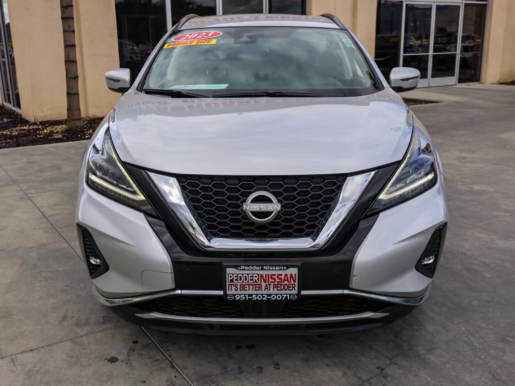UsedThis 2023 Brilliant Silver Metallic Nissan Murano SV FWD is well equipped and includes these features and benefits: CVT with Xtronic, 4-Wheel Disc Brakes, 4.667 Axle Ratio, 6 Speakers, ABS brakes, Air Conditioning, Alloy wheels, AM/FM radio: SiriusXM, AM/FM/CD/MP3/WMA Audio System, Auto High-beam Headlights, Auto-dimming Rear-View mirror, Automatic temperature control, Blind Spot Warning, Brake assist, Bumpers: body-color, Carpeted Floor Mats & Carpeted Cargo Mat, CD player, Child-Seat-Sensing Airbag, Delay-off headlights, Driver door bin, Driver vanity mirror, Dual front impact airbags, Dual front side impact airbags, Electronic Stability Control, Four wheel independent suspension, Front anti-roll bar, Front Bucket Seats, Front Center Armrest, Front dual zone A/C, Front fog lights, Front reading lights, Fully automatic headlights, Heated door mirrors, Heated Front Bucket Seats, Heated front seats, Illuminated entry, Knee airbag, Leatherette-Appointed Seat Trim, Low tire pressure warning, NissanConnect featuring Apple CarPlay and Android Auto, Occupant sensing airbag, Outside temperature display, Overhead airbag, Overhead console, Panic alarm, Passenger door bin, Passenger vanity mirror, Power door mirrors, Power driver seat, Power passenger seat, Power steering, Power windows, Radio data system, Rear anti-roll bar, Rear reading lights, Rear seat center armrest, Rear side impact airbag, Rear window defroster, Rear window wiper, Remote keyless entry, Security system, Speed control, Speed-sensing steering, Speed-Sensitive Wipers, Split folding rear seat, Spoiler, Steering wheel mounted audio controls, Tachometer, Telescoping steering wheel, Tilt steering wheel, Traction control, Trip computer, Turn signal indicator mirrors, Variably intermittent wipers, and Wheels: 18″ Machined Aluminum-Alloy Plus 3 Month 3000 Mile Warranty. See Dealer For Details. We have many different makes and models available including a wide selection of cars, trucks, vans, and SUV’s. Don’t see something you like! Pedder Nissan has access to thousands of new and used vehicles which means we can find the right vehicle FOR YOU. The Advertised Price for any vehicle does not include dealer installed accessories. These accessories can be purchased for an additional cost. All vehicles subject to prior sale. All prices plus government fees and taxes, any finance charges, any dealer document processing charges ($85), any electronic filing charge, and any emission testing charge. Offers and prices not available to other dealers, wholesalers, or brokers. This price may not be combined with any other offer. While every reasonable effort is made to ensure the accuracy of this information, we are not responsible for any errors or omissions contained on these pages. We are proud to serve the Hemet area from our Auto Mall Location. We work with most Credit Unions and we offer Military and First Responder discounts. Please verify all pricing, vehicle equipment, and any additional information in question with Pedder Nissan (951) 766-1446. Apple Car Play/Android Auto, Automatic Climate Control, Backup Camera, CVT with Xtronic. CARFAX One-Owner. Priced below KBB Fair Purchase Price! 2023 Nissan Murano SVClean CARFAX. 20/28 City/Highway MPG