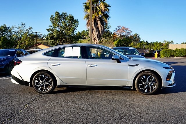 UsedThis 2024 Aero Silver Hyundai Sonata SEL FWD is well equipped and includes these features and benefits: Option Group 01, Dark Gray Cloth, 17″ x 7.0J Aluminum Alloy Wheels, 4-Wheel Disc Brakes, 6 Speakers, ABS brakes, Air Conditioning, Alloy wheels, AM/FM radio: SiriusXM, Apple CarPlay & Android Auto, Auto High-beam Headlights, Automatic temperature control, Brake assist, Bumpers: body-color, Cargo Tray, Carpeted Floor Mats, Delay-off headlights, Driver door bin, Driver vanity mirror, Dual front impact airbags, Dual front side impact airbags, Electronic Stability Control, Emergency communication system: Bluelink, Exterior Parking Camera Rear, First Aid Kit, Four wheel independent suspension, Front anti-roll bar, Front Bucket Seats, Front Center Armrest, Front dual zone A/C, Front reading lights, Fully automatic headlights, Heated door mirrors, Heated Front Bucket Seats, Heated front seats, Illuminated entry, Knee airbag, Low tire pressure warning, Mud Guards, Occupant sensing airbag, Outside temperature display, Overhead airbag, Overhead console, Panic alarm, Passenger door bin, Passenger vanity mirror, Power door mirrors, Power driver seat, Power steering, Power windows, Premium Cloth Seating Surfaces, Radio data system, Radio: AM/FM/HD/SiriusXM, Rear anti-roll bar, Rear seat center armrest, Rear side impact airbag, Rear window defroster, Remote keyless entry, Security system, Speed control, Speed-sensing steering, Speed-Sensitive Wipers, Split folding rear seat, Steering wheel mounted audio controls, Tachometer, Telescoping steering wheel, Tilt steering wheel, Traction control, Trip computer, Trunk Cargo Net, and Variably intermittent wipers. Apple Car Play/Android Auto, Automatic Climate Control, Backup Camera, Dark Gray Cloth.Priced below KBB Fair Purchase Price!CARFAX One-Owner.Poway Hyundai located at 13910 Poway Road, and Poway CDJR are both proud members of the Pedder Auto Group. Like our sister stores, we take great pride in serving all of San Diego County with friendly and professional sales, service and parts. We have one of the largest inventories of quality pre-owned vehicles in the county including a huge selection of Certified Pre-owned Hyundai products to choose from. We offer excellent financing, and a relaxed, no-pressure environment. All prices exclude government fees and taxes, any finance charges, any dealer document preparation charge, dealer installed options, and any emissions test charge. The equipment display is intended to be used as an informational listing of the factory stock equipment and features for this vehicle. Equipment and features may have changed for this vehicle. All information is believed to be accurate but is not guaranteed. For accurate information, pls see dealer for details. Some incentives are OAC and in lieu of others.